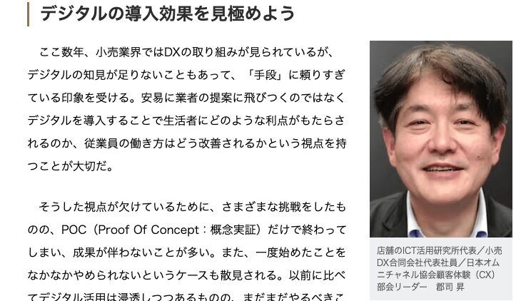 スーパーマーケット中心の流通情報誌であるダイヤモンド・チェーンストアさんに「テクノロジーに振り回されない!「勝つDX」の本質」という特集で原稿依頼されて書いたものです。