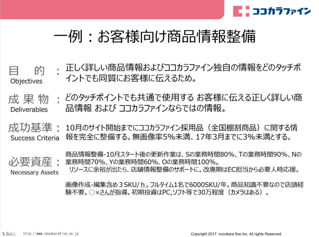 私が前職時代にダイヤモンド・リテイルメディア社の講演で作成した公開情報を以下に添付する。この例のように、戦術レベルでは、必要資産(ヒト・モノ・カネ)も明文化するほうが望ましい。