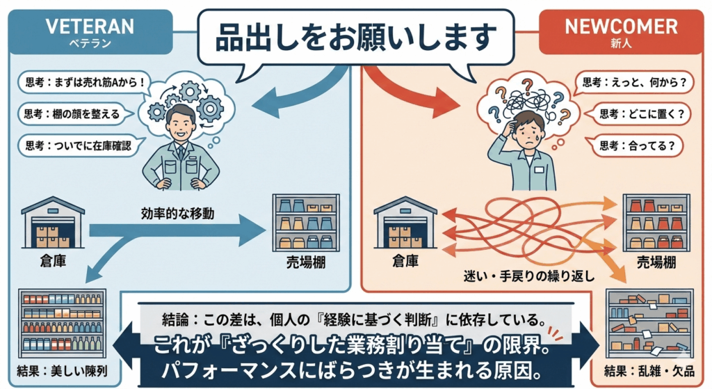 「品出し」という大きな塊を任せると、そこに「判断」が介在します。判断の質は個人の経験に依存し、結果としてパフォーマンスにばらつきが生まれます。