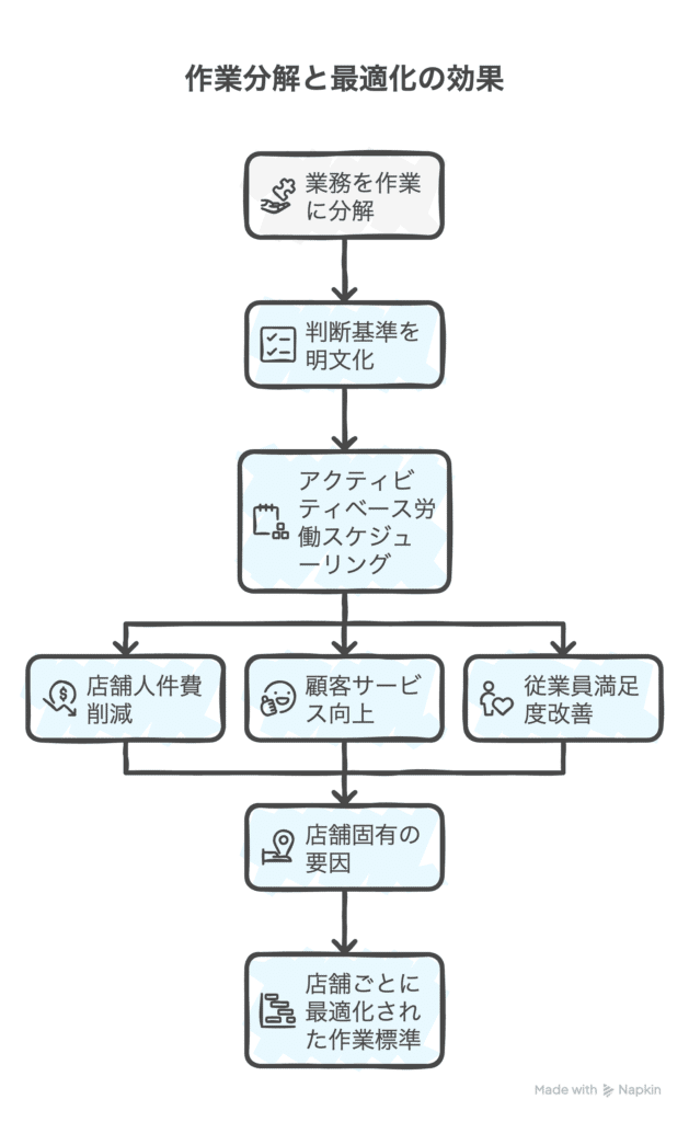 重要なのは、同じ売上でも店舗固有の要因(歩行距離、棚構成、納品頻度など)によって人件費に最大30%の差が生じうるという点です。「一律のルール」ではなく、「店舗ごとに最適化された作業標準」が必要なのです。