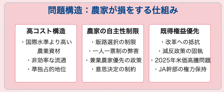 高コストと非効率性:JAは農業資材や生産物の準独占的地位を持ち、農家にとって高コストを生み出しています。肥料・農薬・機械などは国際水準より高価で、流通システムも非効率的です。