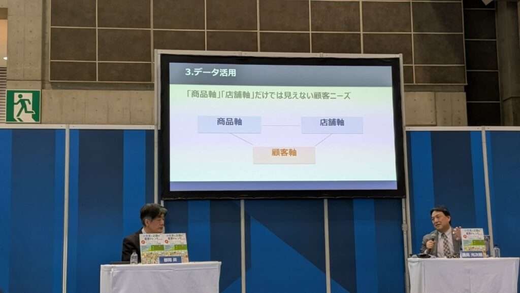 カウンシルメンバーを務めるリテールアジェンダで、スーパー・GMSを運営する平和堂宮領氏、3COINS(スリーコインズ)とアパレルECが急成長しているパルの堀田氏との3人でデータとAI活用のパネルディスカッションを行いました。