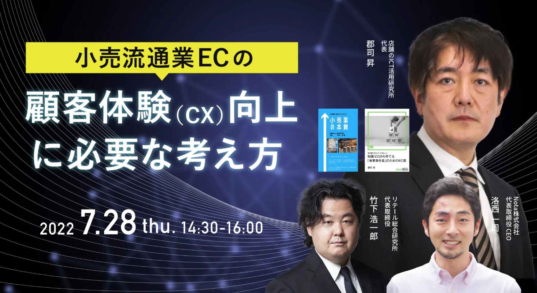タイトル通りのお話しをした後、DX成功事例で著名なホームセンターのグッデイ や 暮らしのマーケットで活用されているFAQシステム「Helpfeel」を提供するNota株式会社 代表取締役CEO洛西 一周氏、リテールガイド竹下編集長とパネルディスカッションをしました。