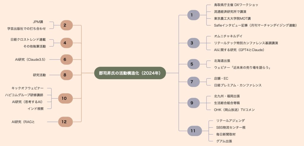 2024年にやったメイン(コンサルティング)以外の仕事や出来事で大きなものだけまとめます。 felo (生成AI)でまとめると下図になります。 1月 鳥取県庁様主催 小売業の課題解決 DXワークショップ https://ngunji.com/work/tottori/ ワークショップそのも...