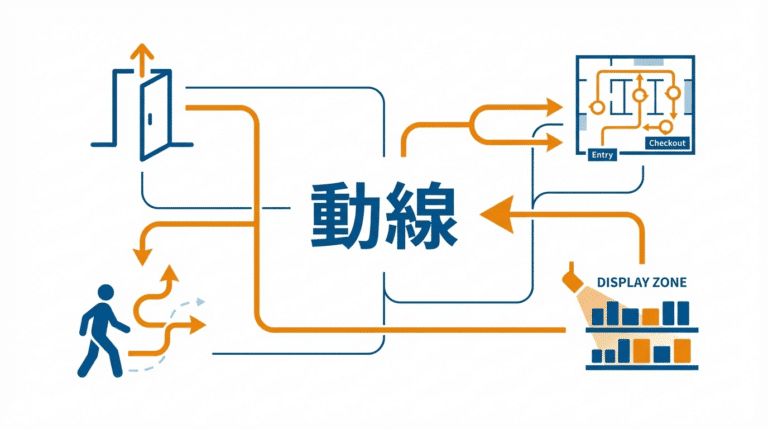 動線(Customer Flow)とは、店舗の中でお客様が移動する経路やその流れを指す言葉です。もともとは建築用語ですが、小売業では「お客様がどこを通り、どこで立ち止まり、何を手に取るか」という購買行動の軌跡として使います。