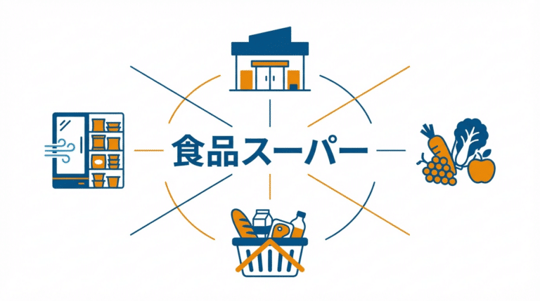 似た業態との違いを整理します。 総合スーパー(GMS:ゼネラルマーチャンダイズストア)は衣食住すべてを扱い、売場面積が数千平方メートル以上になります。一方、食品スーパーは食品に特化しているため、来店頻度が高く、地域密着型の営業が特徴です。ミニスーパー(小型スーパー)は売場面積が250平方メートル未満の小型店舗で、都市部の住宅街やオフィス街に出店する形態です。ディスカウントストアは低価格訴求が主軸であり、品揃えの絞り込みやローコスト運営で差別化します。