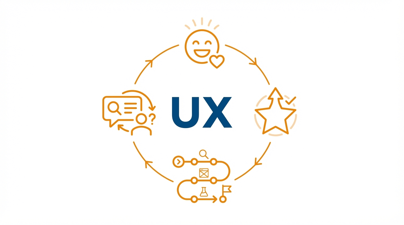 UX(User Experience)とは、ユーザーが製品やサービスを通じて得る「体験全体」を指す概念です。 日本語では「ユーザー体験」と訳されます。単に画面が見やすい・操作しやすいという表面的な話ではなく、サービスを知ってから使い終わるまでの一連の体験すべてが対象です。